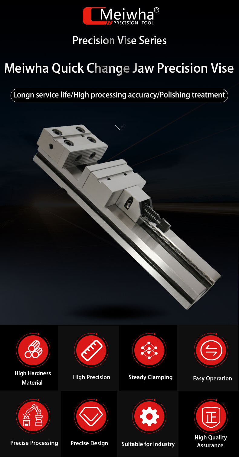 The surface of the Meiwha Precision Vise is quenched, turned, and ground, enabling strong toughness, high tensile strength, and wear resistance. Guide rail surface of Meiwha Precision Vise is a refined ground seamless contact surface. Can be used upright without affecting the accuracy of clamping capacity, for CNC milling machines, drilling machines, and precision parts.